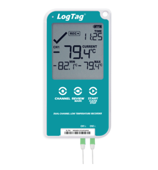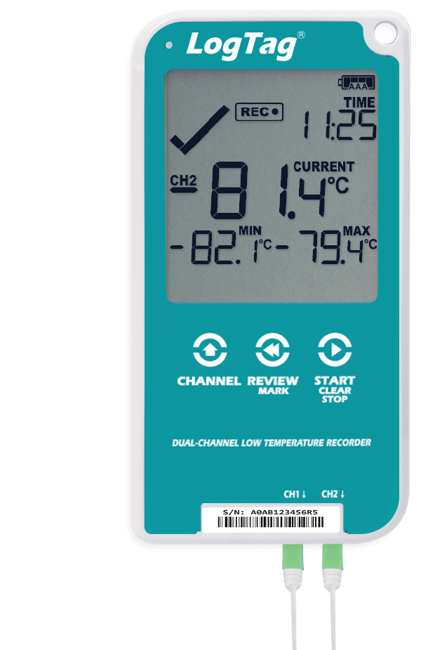 The UTREL30 low temperature vaccine data logger is a -90°C storage monitoring solution with a detailed LCD display, delivering current and historical temperature information locally via its interface and buttons.